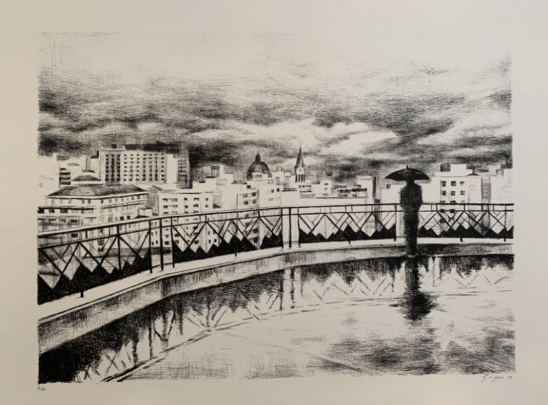 Gregório Gruber (Santos, SP, 1951) transitou pela música e pelo multimídia no início da formação artística, contudo se notabilizou pela destacada mirada autoral e lírica da metrópole paulistana, em especial nos registros do Centro. A arquitetura que sobressai entre poder e desgaste, energia e esvaziamento, por entre planos, volumes e cromatismos particulares, pode ser vista em diferentes linguagens, como a pintura, a gravura e o desenho.
