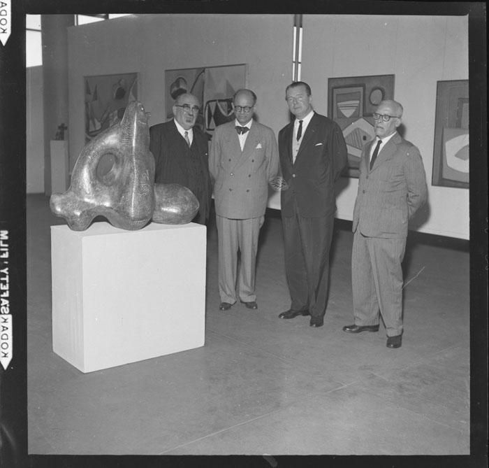 Francisco Matarazzo Sobrinho, na entrega da escultura "O índio e a suaçuapara", de autoria de Victor Brecheret, oferecida a cidade da Antuérpia, ao embaixador da Bélgica no Brasil, Sr. Louis Colot e ao cônsul geral, Maurice Wechx.