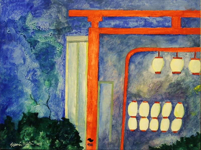 Tela com cena de poste de luz, bairro liberdade, predominância em azul [...]