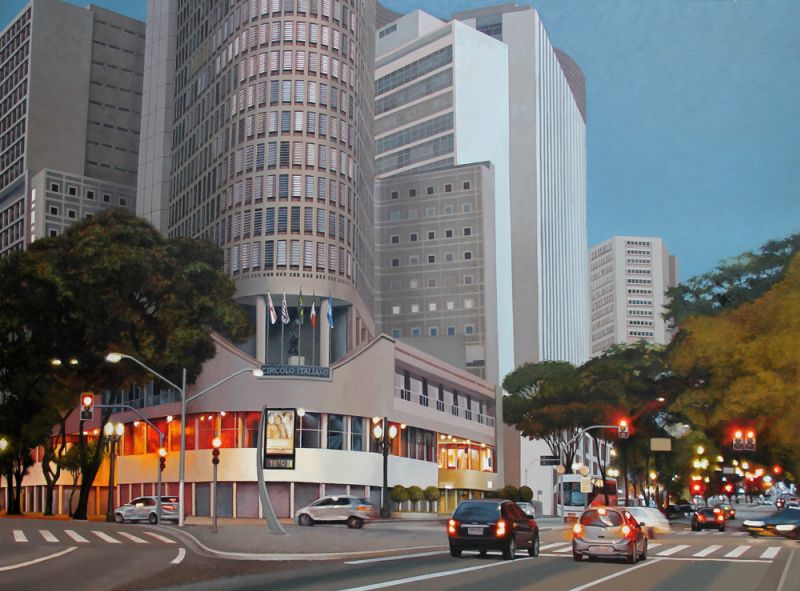 Cidade, prédios, carros, predominância em azul e cinza [...]