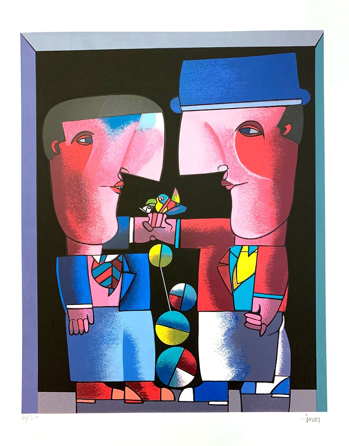 Dois equilibristas, malabaristas com bolas. Predominância em rosa. Compre esta obra com desconto à vista com nossos consultores.